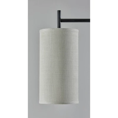 Stylishly illuminate any room with the contemporary design elements of the Zion floor lamp. The base and stand are constructed of monochrome black metal and feature clean lines and angles. A long slender pole rises from the compact rectangular base and supports a short arm. Suspended from the arm is a tall drum shade made of beige textured fabric that softly diffuses the light from a 100W bulb. Operated by a rotary switch to easily turn it on or off, the lamp also includes a 5′ black cord. The floor lamp is also available in antique brass with a white textured shade.