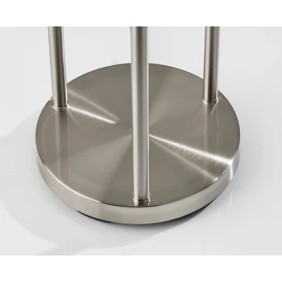 Bring a blend of style and function to your space with the 63″ Bianca floor lamp. Featuring two 10″ round frosted acrylic shelves, this lamp provides storage and display opportunities. The bottom shelf has a clearance of 34.75″, making it a perfect place to display vases, picture frames, or other taller items, while the 20″ clearance for the top shelf makes it ideal for placing drink glasses, phones, or other smaller pieces. The 10″ metal base with a brushed steel finish makes for a sturdy design, while the three brushed steel poles arranged in a triangular pattern rise cleanly to three lighting heads of varying heights for an eye-catching design. The three 7″ globe shades are made of white opal glass that complement the shelving and can be operated separately with pull chains, allowing you to control the amount of lighting. Each of the three globe shades ensconce 40W bulbs (not included), while the lamp also features a 5′ clear cord. The Bianca floor lamp is also available with an antique brass finish.