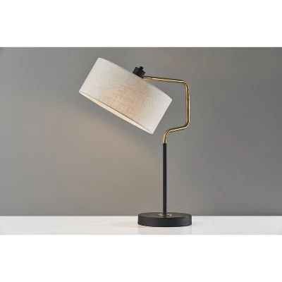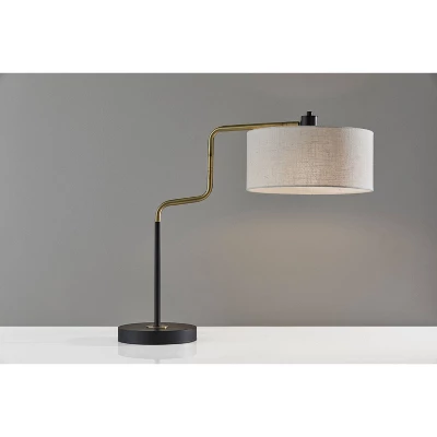 Clean lines and a modern, short drum shaped shade update the classic swing-arm style of the Jacob Table Lamp. A mix of black and brass metals add mid-century flare. The white fabric shade has soft flecks of natural colors, revealing a unique and beautiful texture when lit. Swing the arm to focus light where you desire. Bulb is not included.