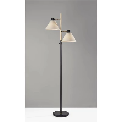 Brighten your space with the mid-century modern flare of the 69″ tall Matthew tree floor lamp. With a geometric design that focuses on the simplicity of clean lines, the lamp’s compact construction fits easily behind or beside furniture. Featuring black metal finish contrasted with antique brass accents, the tree floor lamp has an 11″ diameter round base supporting a thin, tall pole. Attached to the pole by antique brass accent pieces are two cone-shaped shades facing opposing directions. The shades are made of cream textured fabric to softly diffuse the 100W bulbs (not included). The lamp is easily turned on or off with a rotary switch located on the pole and is powered by a 6′ black cord. Complete your décor with the coordinating Matthew floor lamp and table lamp.